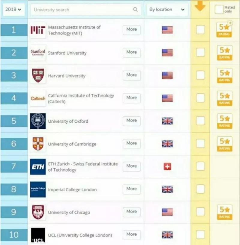 麻省理工学院(MIT)创纪录地第七次排名世界第一,连续7年稳坐QS综排霸主地位。斯坦福大学、哈佛大学和加州理工学院紧随其后。瑞士的苏黎世联邦理工学院上位排名第7。