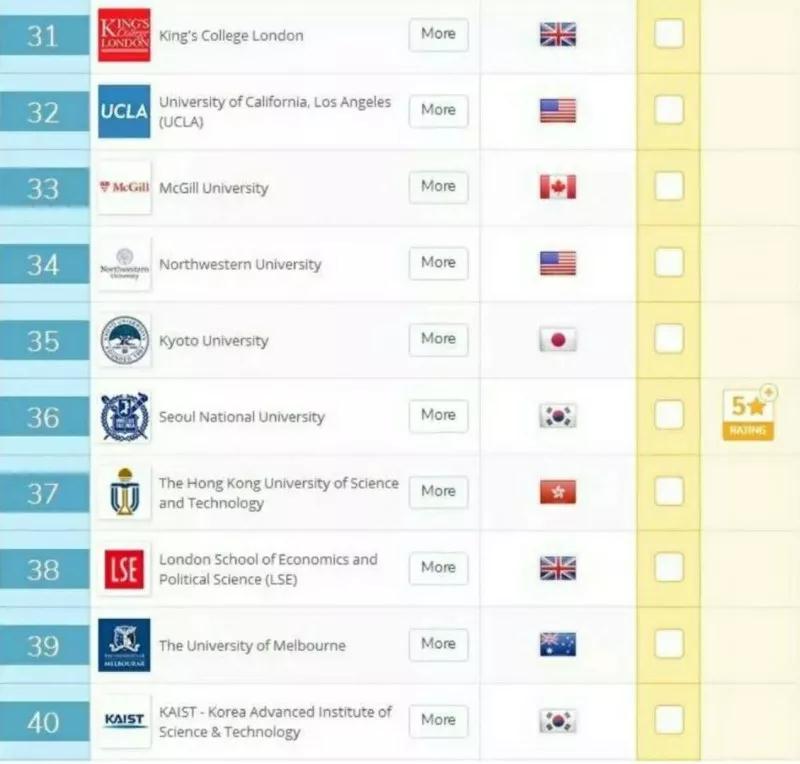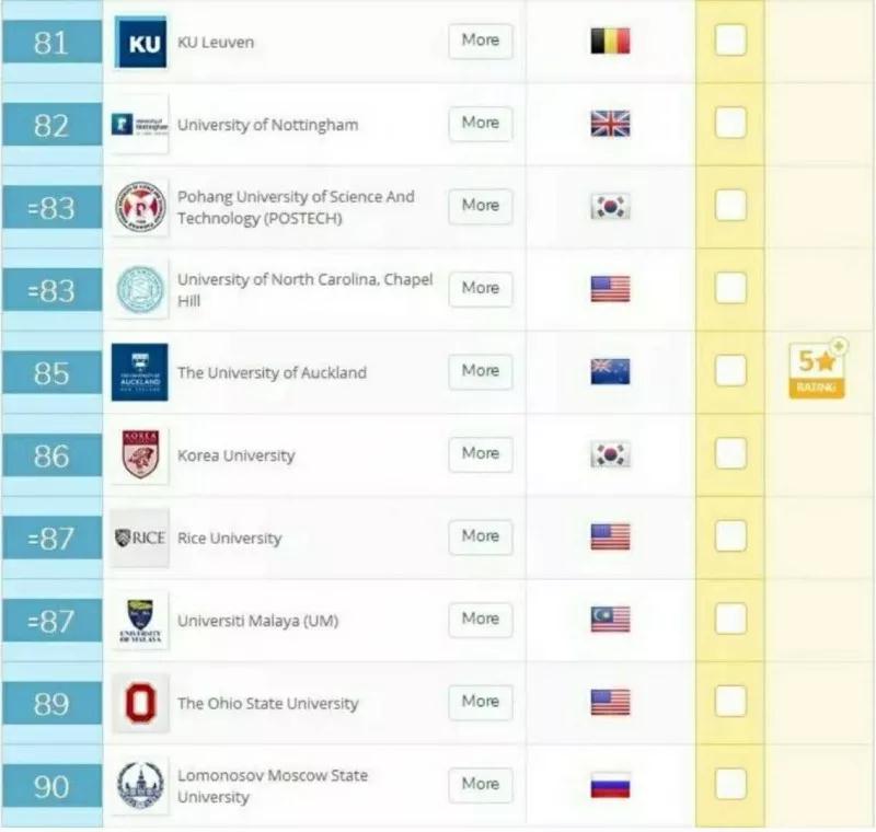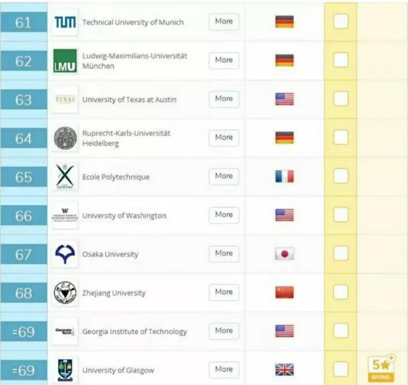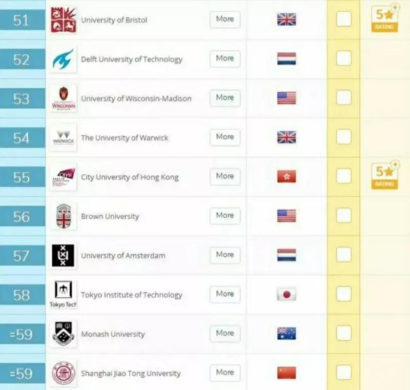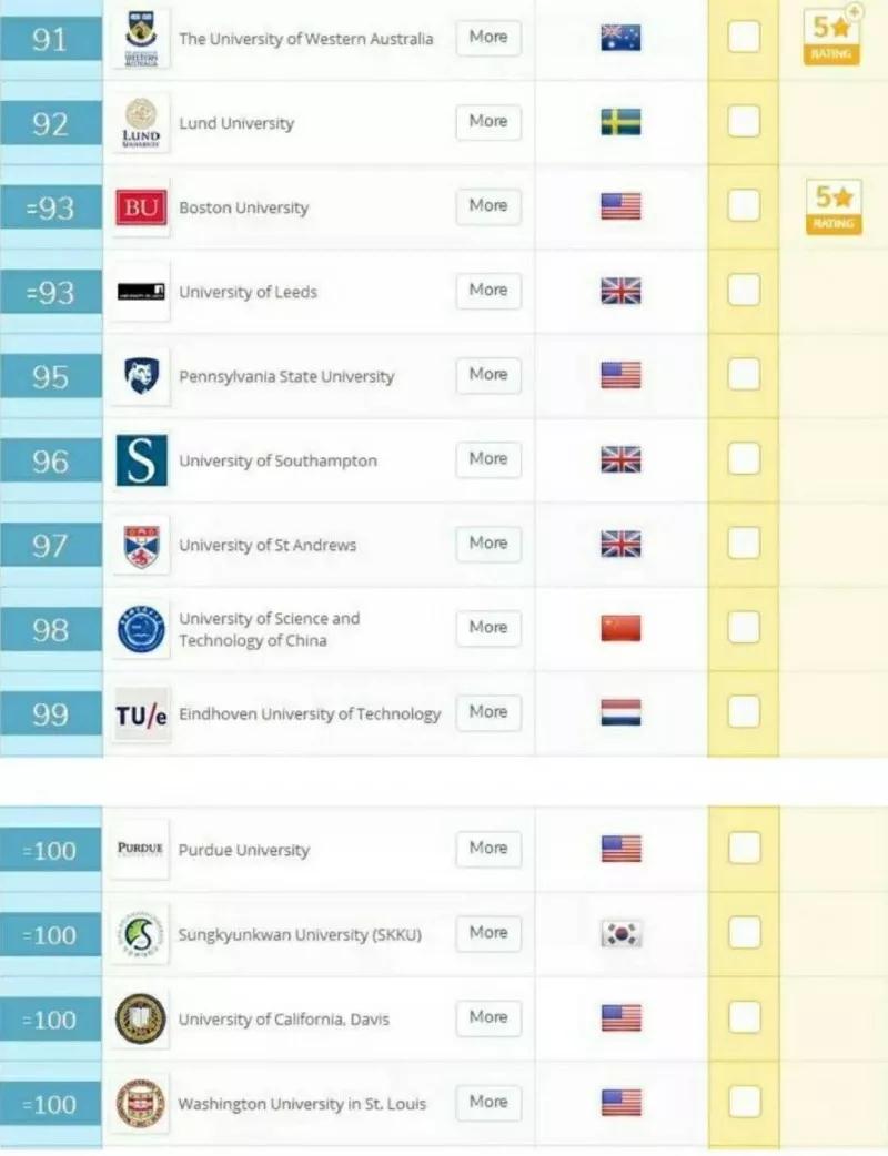 Top 100的中国大学共6所。分别是:清华大学(NO.17)、北京大学(NO.30)、复旦大学(NO.44)、上海交通大学(NO.68)、国科学技术大学(NO.98)。